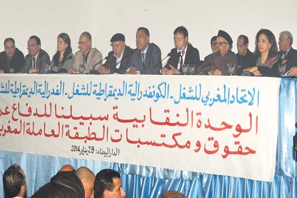 بعدما توالت قرارات الحكومة المغضبة للنقابات، فضلت قيادات الاتحاد المغربي للشغل، الفيدرالية الديموقراطية والكنفدرالية الديموقراطية للشغل المجتمعة مساء أول أمس الأربعاء بمقر نقابة «المحجوب بن الصديق»، حيث أكدت خلال ندوة مشتركة احتفاظها بأوراق التصعيد التي تفرضها طبيعة المرحلة، حين إيفاد وفد نقابي ثلاثي التركيبة إلى رئيس الحكومة وسط الأسبوع المقبل، لمدة بمذكرة مشتركة تضم مطالب النقابات الثلاث.