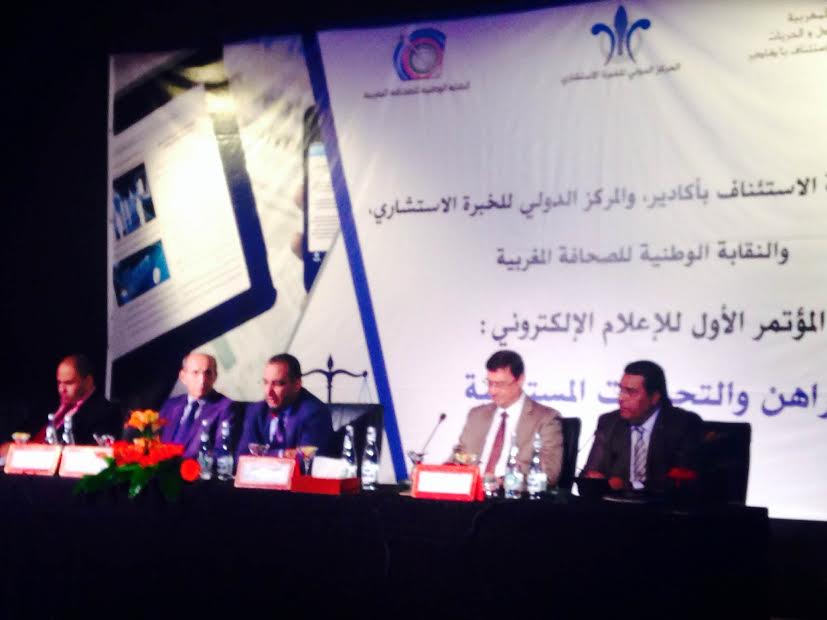 في ظل ما يشهده العالم من تحولات جديدة في التكنولوجيا الرقمية ، التي أثبتت قدرتها على تحقيق نتائج ايجابية ليس فقط على المستوى الاقتصادي بل و في كل مناحي الحياة ، فالإعلام الالكتروني بات عاملا مهما في تكوين المجتمع، و لم يعد من المقبول المضي قدما دون وجود لقاء يجمع المهتمين و المتخصصين في هذه المهنة لطرح مختلف القضايا التقنية و الفنية التي تساعد في تطوير النقاش و تبادل وجهات النظر . وارتباطا بالموضوع نظمت محكمة الاستئناف بأكادير والمركز الدولي للخبرة الاستشاري و النقابة الوطنية للصحافة المغربية يوم السبت 13 يونيو 2015 المؤتمر الأول حول الاعلام الالكتروني ” الراهن و التحديات المستقبلية ” . وقد عرفت الجلسة الافتتاحية التي أعطى انطلاقتها الدكتور ضياء نعمان رئيس المؤتمر ، عدة كلمات تفضل بإلقائها كل من : الرئيس الأول لمحكمة الاستئناف بأكادير ذ عبد الله الجعفري و الأمين العام للنقابة الوطنية للصحافة المغربية ذ يونس مجاهد و نقيب هيئة المحامين لدى محكمتي الاستئناف بأكادير و العيون ذ محمد أمين بيزولال و اللجنة المنظمة للمؤتمر ذ هشام الحسني نائب و كيل الملك بالمحكمة الابتدائية بأكادير .و في سياق متصل نوقشت عدة مواضيع قاربت المحاور التالية :