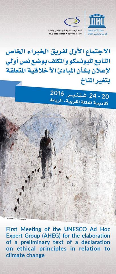 في اطار جهود اليونسكو الرامية الى ادماج رؤية أخلاقية في مكافحة التغيرات المناخية، أطلقت المنظمة مسارا للتفكير والحوار من أجل التوافق حول نص اعلان عالمي للمبادئ الأخلاقية بخصوص التغيرات المناخية من شأنه تشجيع الحكومات والمقاولات والخواص على التقليص من انبعاثات غاز الكربون. في هذا الاطارتستضيف اللجنة الوطنية المغربية للتربية والعلوم والثقافة فريقا للخبراء الدوليين يجتمعون لأول مرة بأكاديمية المملكة بالرباط من 20 الى 24 سبتمبر الجاري، من أجل اعداد مشروع اعلان عالمي لأخلاقيات التغير المناخي ، ستعمل منظمة اليونسكو على مناقشته والمصادقة عليه في مؤتمرها العام خلال سنة 2017.