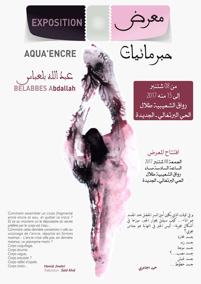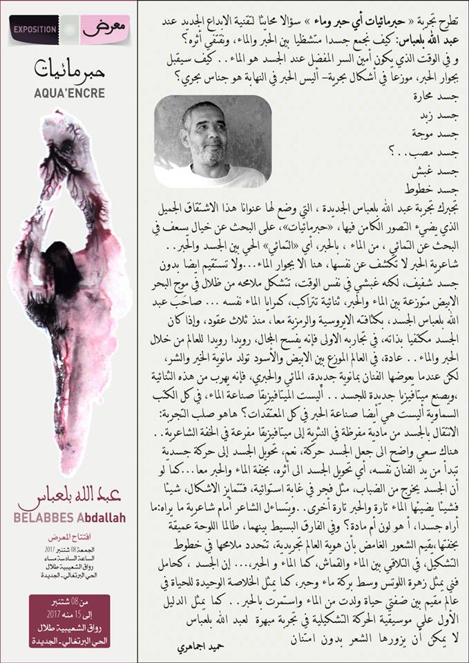 معرض “حبرمائيات”، الذي كتب مقدمة كاتالوغه الشاعر عبد الحميد جماهري، يحتضن افتتاحه رواق الشعيبة طلال بالقلعة البرتغالية بالجديدة في الساعة السادسة من مساء الجمعة 8 شتنبر الجاري، ويستمر إلى يوم 15 من نفس الشهر.