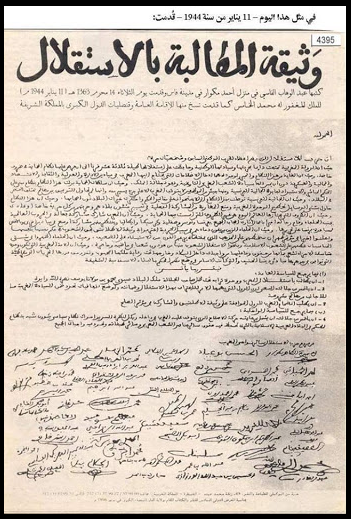 الحمد لله إن حزب الاستقلال الذي يضم أعضاء الحزب الوطني السابق وشخصيات حرة: حيث إن الدولة المغربية تمتعت دائما بحريتها وسيادتها الوطنية وحافظت على استقلالها طيلة ثلاثة عشر قرنا إلى أن فرض عليها نظام الحماية في ظروف خاصة وحيث أن الغاية من هذا النظام والمبرر لوجوده هما إدخال الإصلاحات التي يحتاج إليها المغرب في ميادين الإدارة والعدلية والثقافة والاقتصاد والمالية والعسكرية دون أن يمس ذلك بسيادة الشعب المغربي التاريخية ونفوذ جلالة الملك وحيث أن سلطات الحماية بدلت هذا النظام بنظام مبني على الحكم المباشر والاستبداد لفائدة الجالية الفرنسية ومنها جيش من الموظفين لا يتوقف المغرب إلا على جزء يسير منه وأنها لم تحاول التوفيق بين مصالح مختلف العناصر في البلاد وحيث أن الجالية الفرنسية توصلت بهذا النظام إلى الاستحواذ على مقاليد الحكم واحتكرت خيرات البلاد دون أصحابها وحيث أن هذا النظام حاول بشتى الوسائل تحطيم الوحدة المغربية ومنع المغاربة من المشاركة الفعلية في تسيير شؤون بلادهم ومنعهم من كل حرية خاصة أو عامة وحيث أن الظروف التي يجتازها العالم اليوم هي غير الظروف التي أسست فيها الحماية وحيث أن المغرب شارك مشاركة فعالة في الحروب العالمية بجانب الحلفاء وقام رجاله أخيرا بأعمال أثارت إعجاب الجميع في فرنسا وتونس وصقلية وكرسيكا وإيطاليا، وينتظر منهم مشاركة أوسع في ميادين أخرى وبالأخص لمساعدة فرنسا على تحريرها وحيث أن الحلفاء الذين يريقون دماءهم في سبيل الحرية اعترفوا في وثيقة الأطلنتي بحق الشعوب في حكم نفسها بنفسها، وأعلنوا أخيرا في مؤتمر طهران سخطهم على المذهب الذي بمقتضاه يزعم القوي حق الاستيلاء على الضعيف وحيث أن الحلفاء أظهروا في شتى المناسبات عطفهم على الشعوب الإسلامية ومنحوا الاستقلال لشعوب منها من هو دون شعبنا في ماضيه وحاضره وحيث أن الأمة المغربية التي تكون وحدة متناسقة الأجزاء تشعر بما لها من الحقوق وما عليها من واجبات داخل البلاد وخارجها تحت رعاية ملكها المحبوب وتقدر حق قدرها الحريات الديمقراطية التي يوافق جوهرها مبادئ ديننا الحنيف والتي كانت الأساس في وضع نظام الحكم بالبلاد الإسلامية الشقيقة.