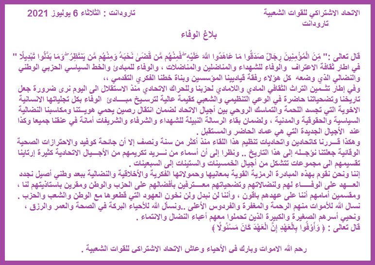 ” في اطار ثقافة الاعتراف والوفاء للشهداء والمناضلين والمناضلات ، والوفاء للمبادئ والخط السياسي الحزبي الوطني والنضالي الذي وضعه كل هؤلاء رفقة قياديينا المؤسسين وبناة خطنا الفكري التقدمي. وفي اطار تثمين التراث الثقافي المادي واللامادي لحزبنا وللحراك الاتحادي منذ الاستقلال الى اليوم.نرى ضرورة جعل تاريخنا وتضحياتنا حاضرة في الوعي التنظيمي والشعبي كقيمة عالية لترسيخ مبادئ الوفاء بكل تجلياتها الانسانية الاخوية التي تجسد اللحمة والتماسك الروحي بين اجيال الاتحاد لضمان انتقال رصين يحمي هويتنا ومكاسبنا النضالية السياسية والحقوقية والمدنية ، ولضمان بقاء الرسالة النبيلة للشهداء والشرفاء والشريفات امانة في عنقنا جميعا وكذا في الاجيال الجديدة التي هي عماد الحاضر والمستقبل .وهكذا قررنا كاتحادين واتحاديات تنظيم هذا اللقاء منذ اكثر من سنة ونصف الا ان جائحة كوفيد بالاحترازات الصحية الوقائية جعلتنا نؤجله الى هذا التاريخ ..ونظرا الى ان اسماء من نريد تكريمهم من الاجيال الاتحادية كثيرة ارتأينا تقسيمهم الى مجموعتين تتشكلان من اجيال الخمسينات والستينات الى السبعينات …اننا ونحن نقوم بهذه المبادرة الرمزية القوية بمعانيها وحمولاتها الفكرية والاخلاقية والنضالية ببعد وطني اصيل نجدد العهد على الوفاء لهم ولنضالاتهم وتضحياتهم معترفين بأفضالهم على الحزب والوطن ومقرين بأستاذيتهم لنا ، ومقسمين امامهم اننا على عهدهم باقون واننا لن نبدل ولن نخون العهود التي قطعوها مع الوطن والشعب والحزب …نسال الله للأموات منهم الرحمة والمغفرة والفردوس الاعلى ..ونسال الله للأحياء البركة في الصحة والعمر والرزق ونحيي اسرهم الصغيرة والكبيرة الذين تحملوا معهم اعباء النضال والانتماء .قال تعالى : ﴿ وَأَوْفُوا بِالْعَهْدِ إِنَّ الْعَهْدَ كَانَ مَسْئُولًا ﴾رحم الله الاموات وبارك في الاحياء وعاش الاتحاد الاشتراكي للقوات الشعبية ” .