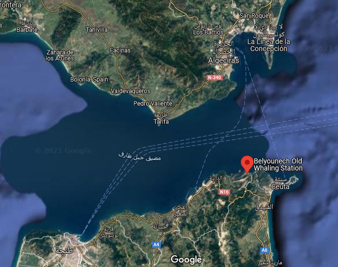 هنا يصبح مضيق جبل طارق، الفاصل بين المغرب وإسبانيا وجبل طارق (وأيضا ما بين القارة الإفريقية والقارة الأروبية) مجرد نهر كبير.