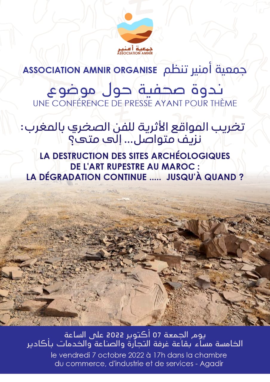 تتابع الجمعيات والهيئات الموقعة أسفله بقلق شديد ارتفاع وتيرة التخريب الذي يطال منذ مدة المواقع الأثرية بمختلف جهات المملكة، خاصة مواقع الفن الصخري والمعالم الثقافية المرافقة لها (معالم جنائزية، تمركزات الصناعات الحجرية…)، آخرها ما تعرض له الموقع الأثري ”واخير” (جماعة كتاوة، إقليم زاكَورة) المسجل في فهرس مواقع النقوش الصخرية تحت رقم 150039.