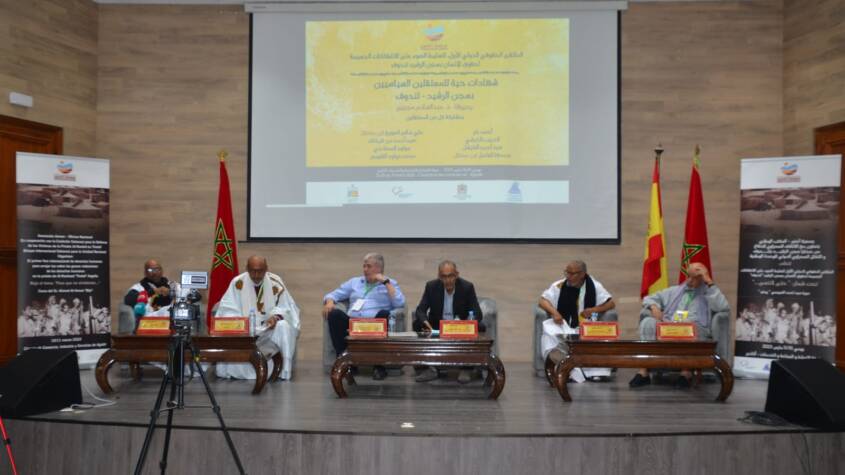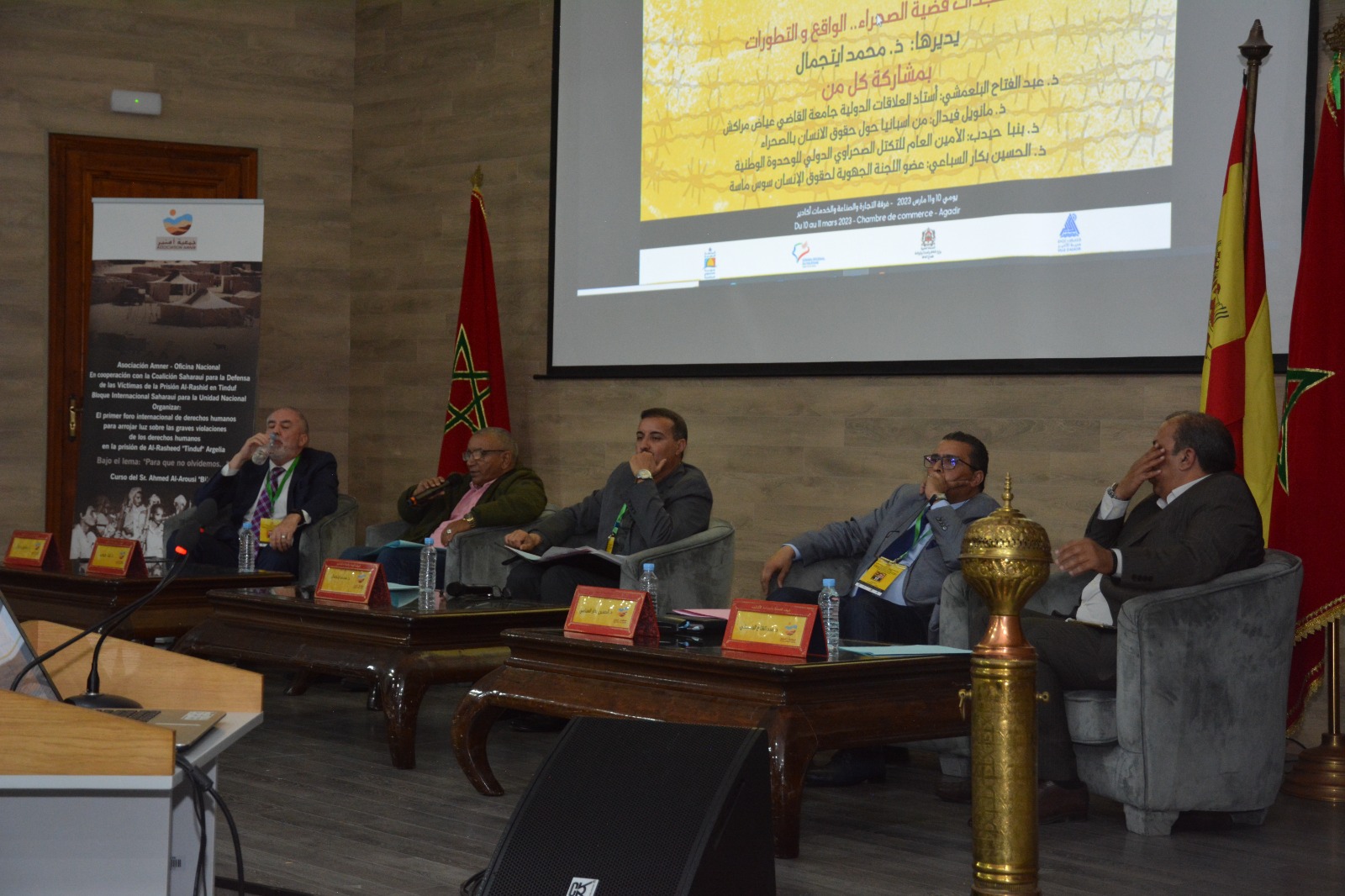 انطلق الندوة الموضوعاتية حول: “مستجدات قضية الصحراء.. الواقع والتطورات” قام تيسيرها الأستاذ الدكتور محمد أيتجمال، حيث تناول فيها المتدخل الدكتور عبد الفتاح البلعمشي، مستجدات قضية وحدتنا الترابية، والتطورات السياسية التي عرفها الملف في السنوات القليلة الأخيرة، تلتها مداخلة الإسباني منويل ڤيدال حول حقوق الإنسان بمخيمات تندوف والظروف المزرية التي يعيشها اللاجئين بتلك المخيمات. وعمل الأستاذ بنبا حيدب بترجمة المداخلة، واختتمت الندوة بمداخلة الأستاذ الدكتور الحسين بكار السباعي، حيث تناول في مداخلته وضعية حقوق الأطفال والمرأة بمخيمات تندوف.