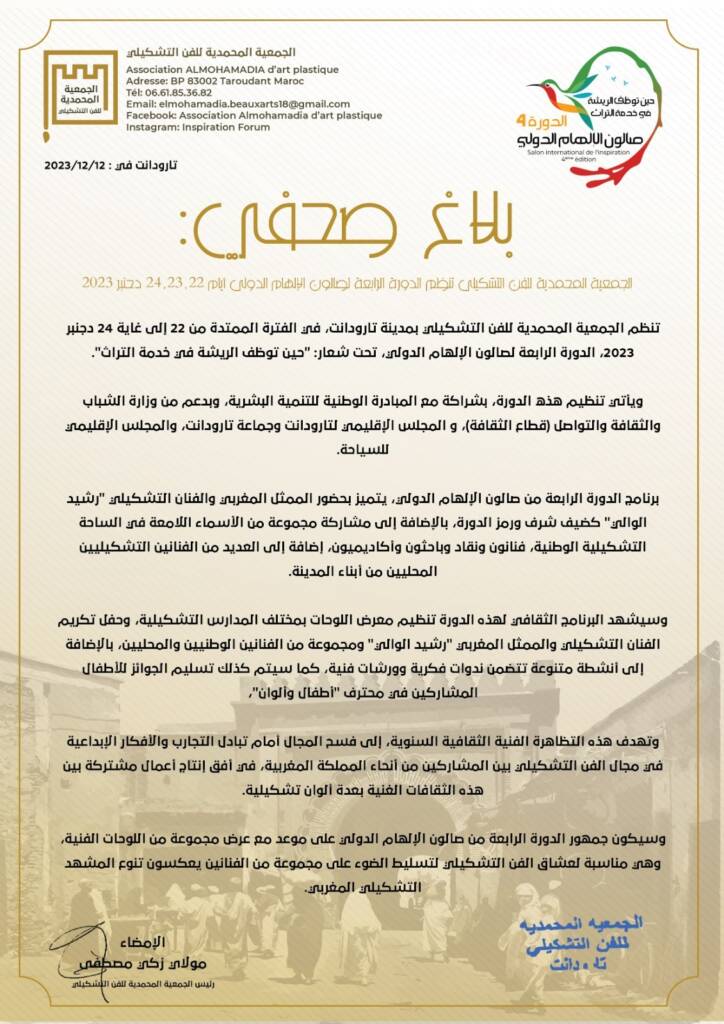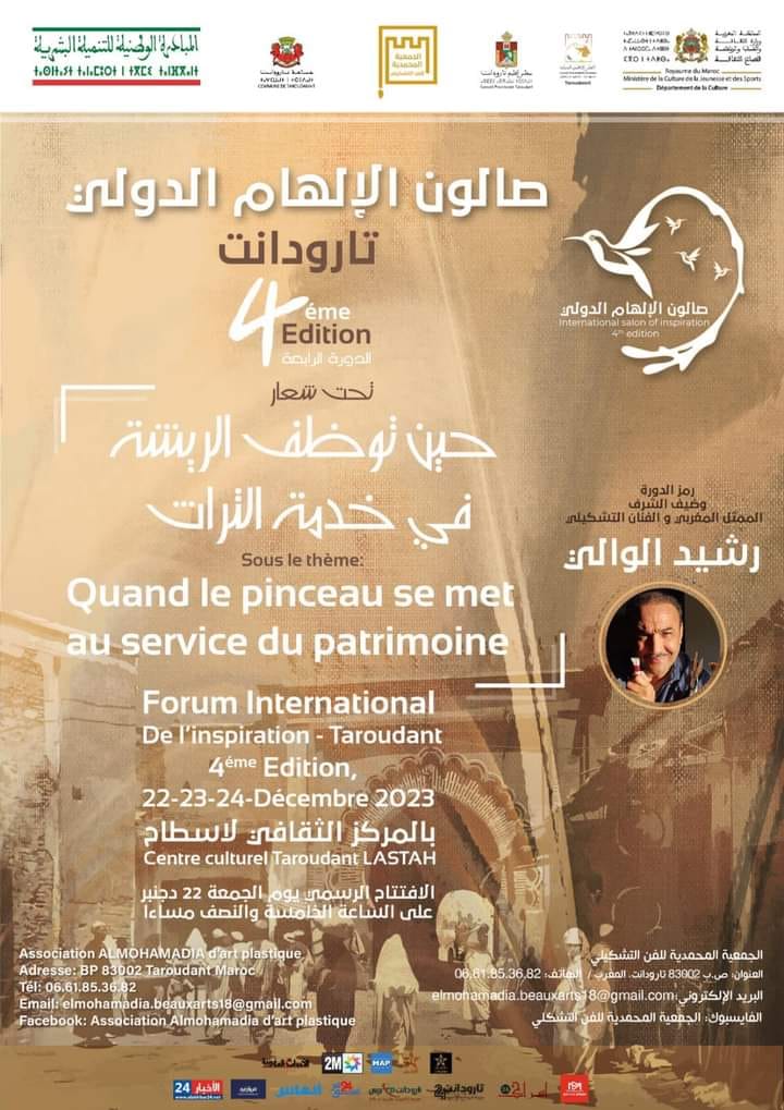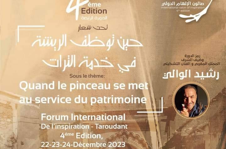 تنظم الجمعية المحمدية للفن التشكيلي بمدينة تارودانت، في الفترة الممتدة ما بين 22 و 24 دجنبر 2023، الدورة الرابعة لصالون الإلهام الدولي، تحت شعار: “حين توظف الريشة في خدمة التراث”.